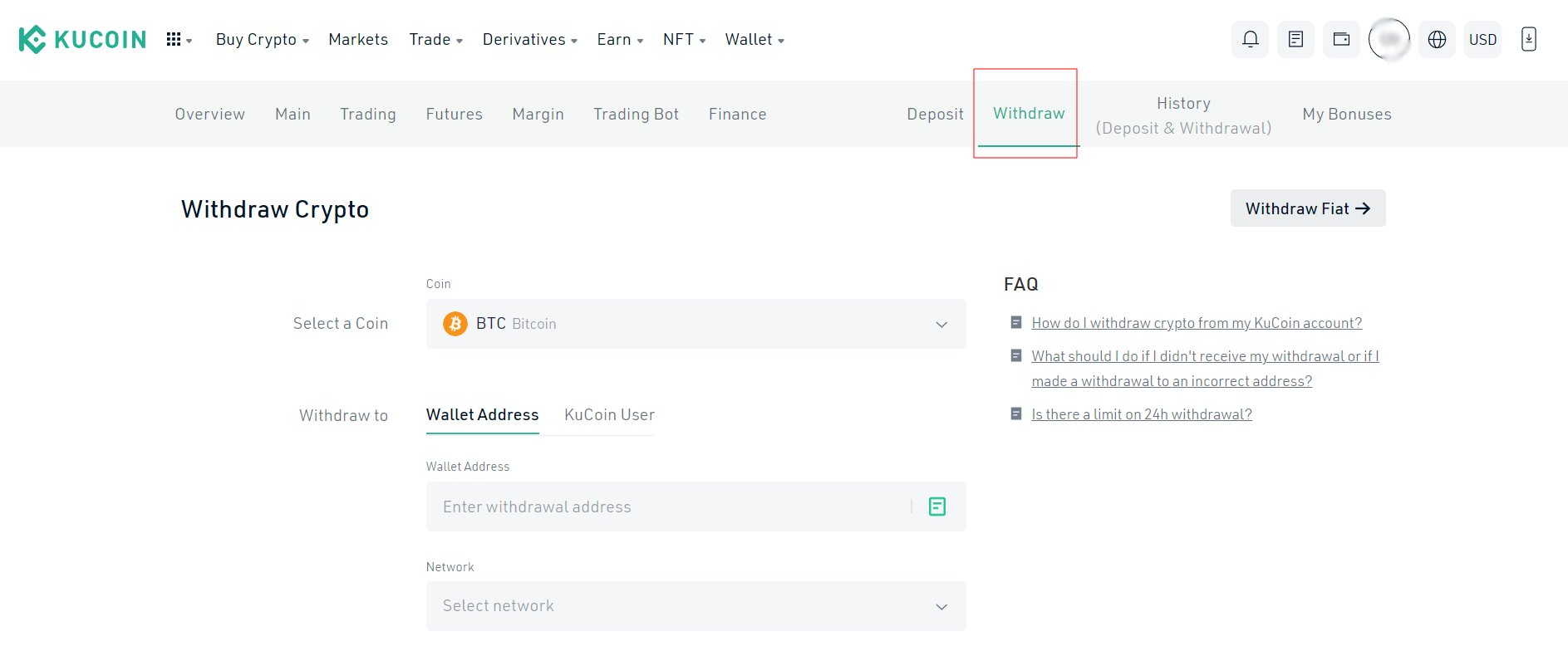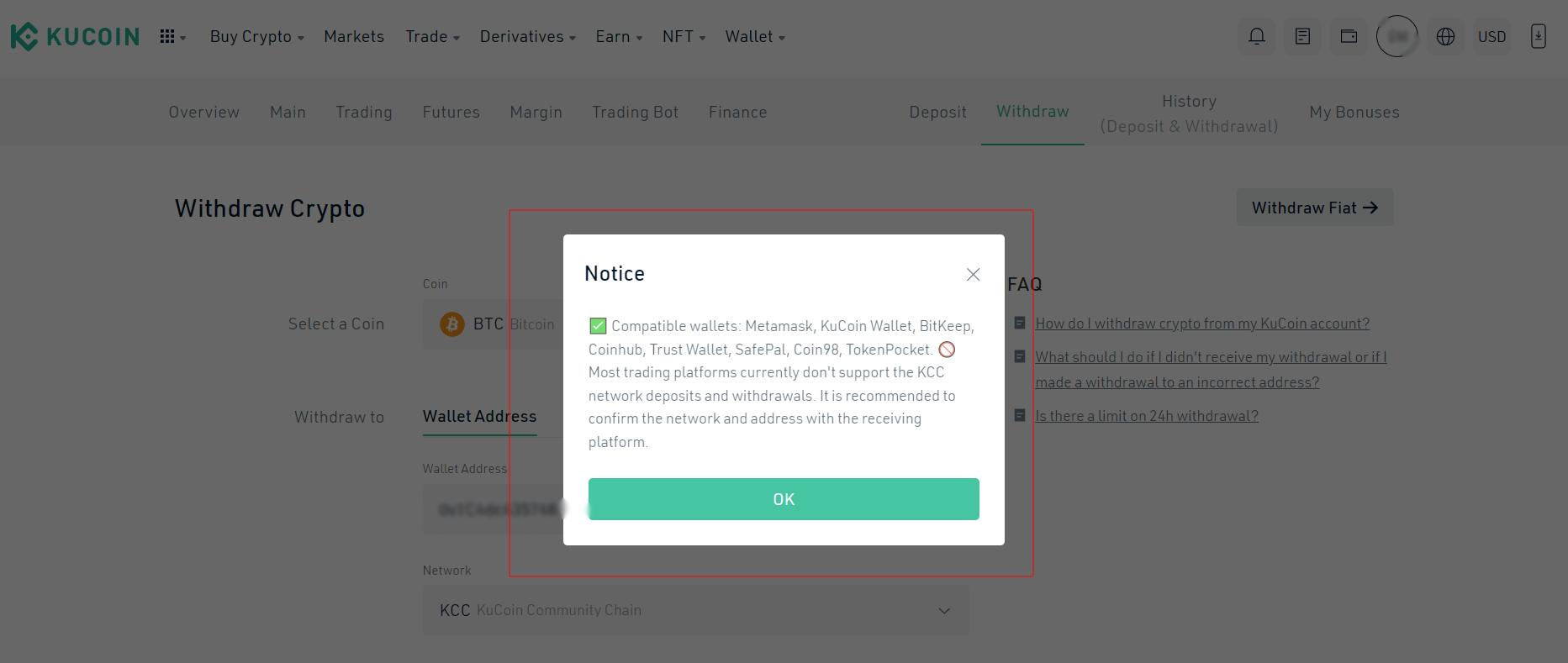4\. On the withdrawal page, you can select a token and enter the target KCC wallet address.